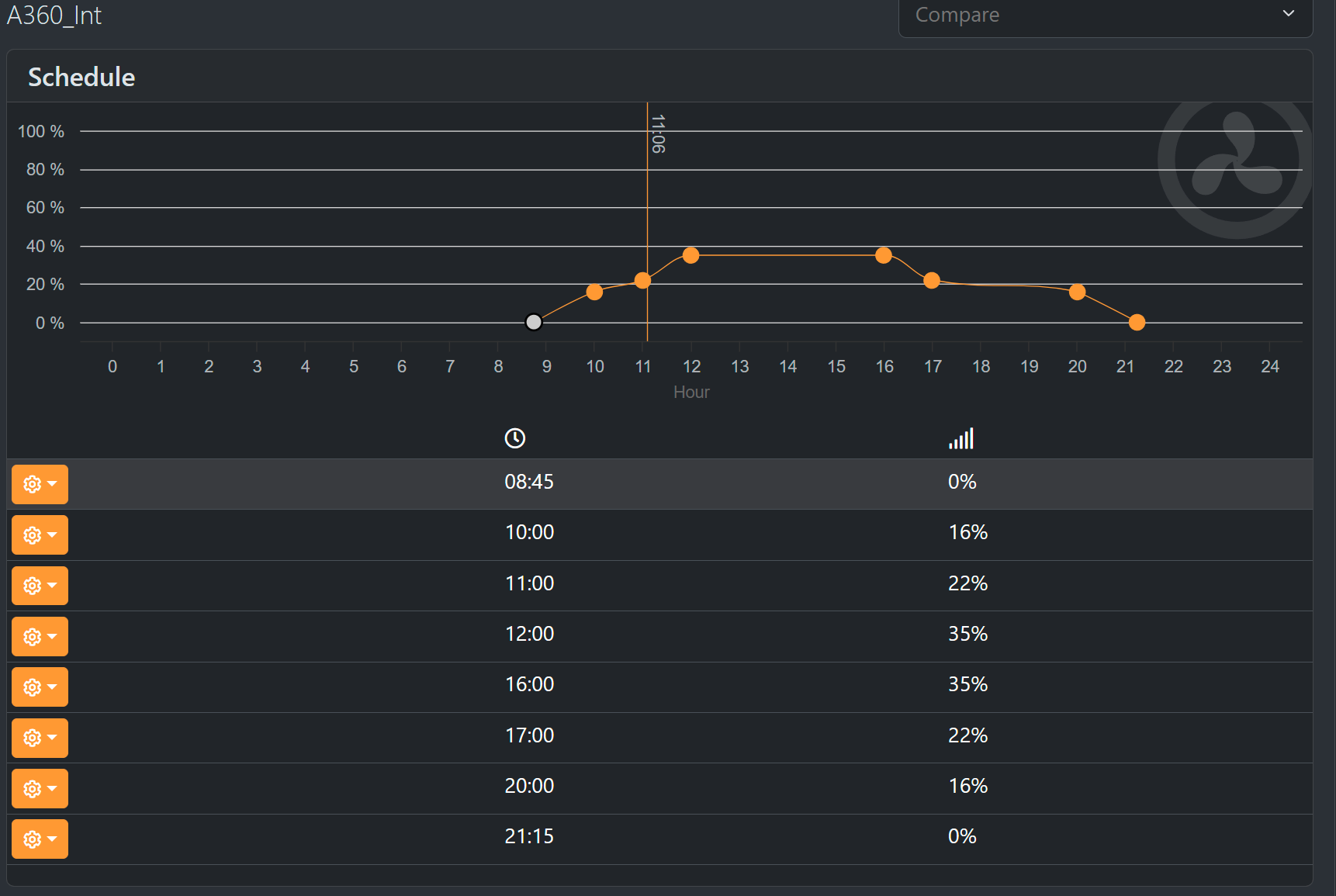 Jeg har 12 timers lys med ramp up/down i ab+ (Blå område) på Ecotech lamperne på 0-35% intensitet 09:00-21:00, Kessil tænder med lang ramp up/down 10:00 - 20:00 og Orphek fra 14:00-18:00.