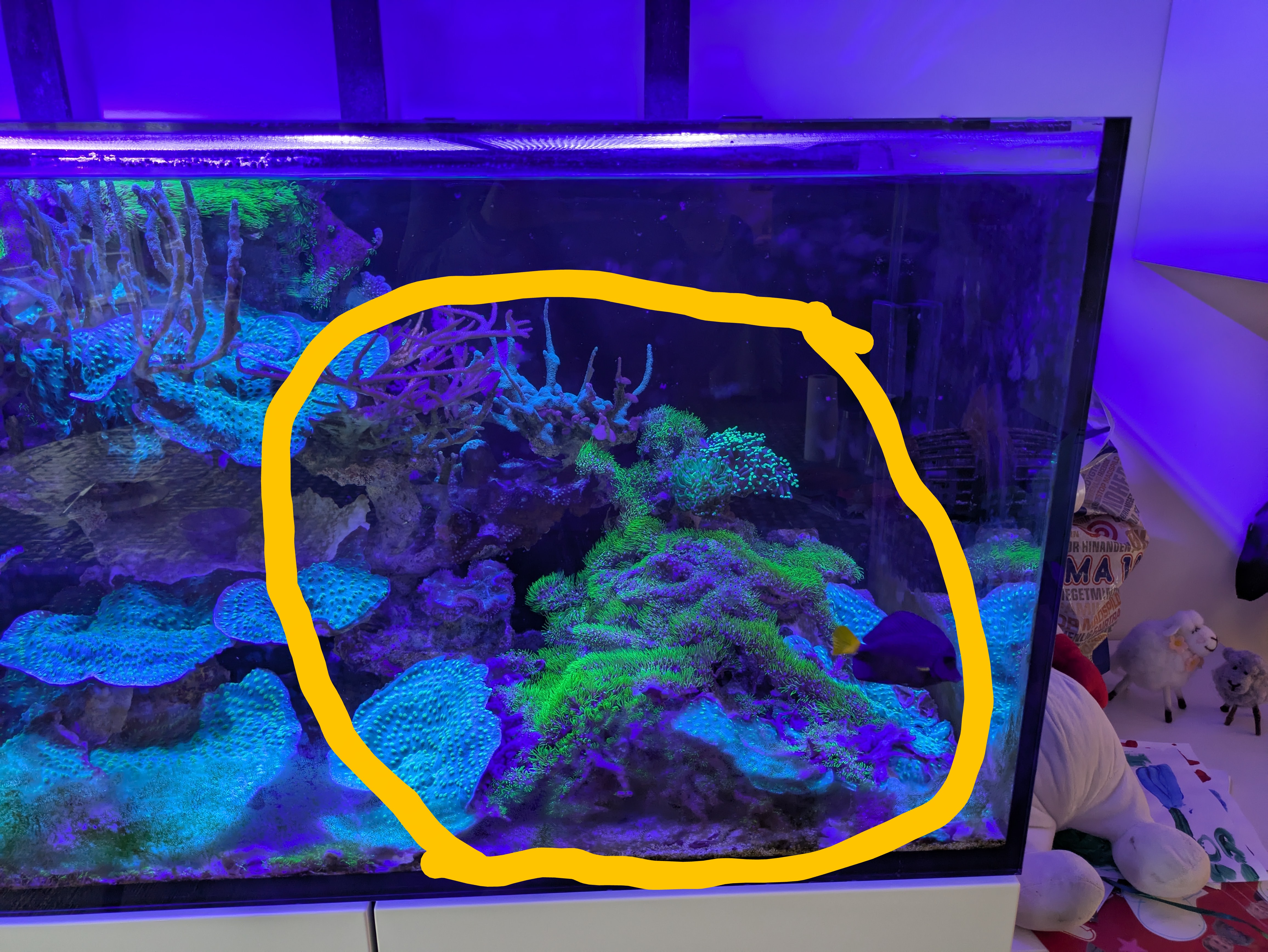 Jeg skal lave om i mit akvarie og skal derfor af med nogle sten og koraller. Den markerede dekoration på billedet er cirka 40 cm i dybden og 50 cm i længden. Højeste punkt uden korallerne er cirka 30 cm. Stenen er ved at blive fyldt med GSP. Der er dog også 2 hammer koraller og diverse SPS på stenen. Stenen har været i akvariet i 5 år. 1000 kroner for det hele eller kom med et bud.