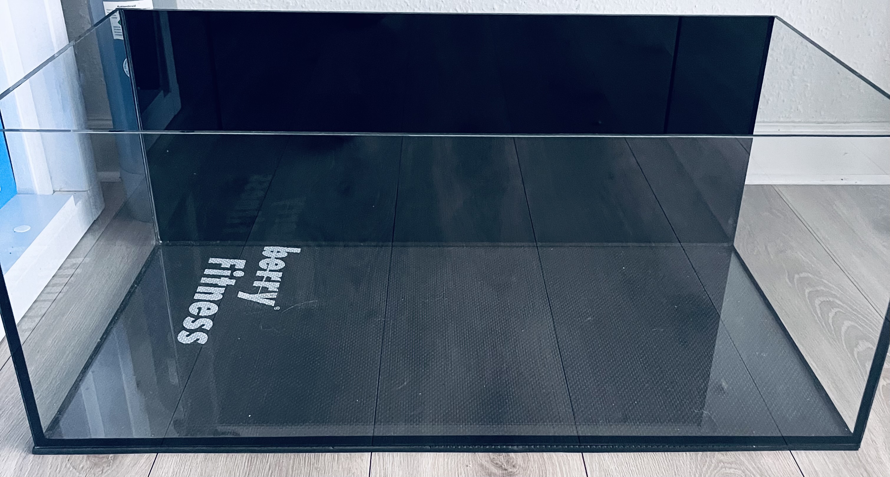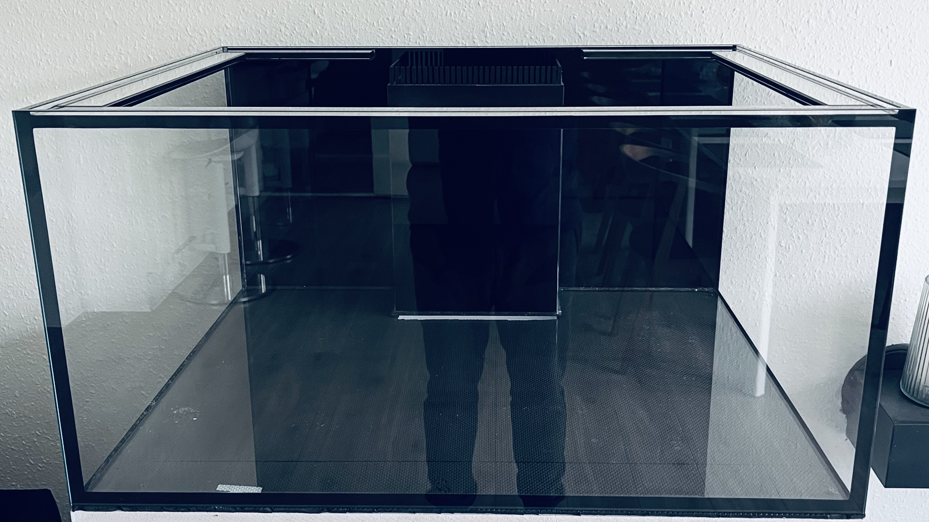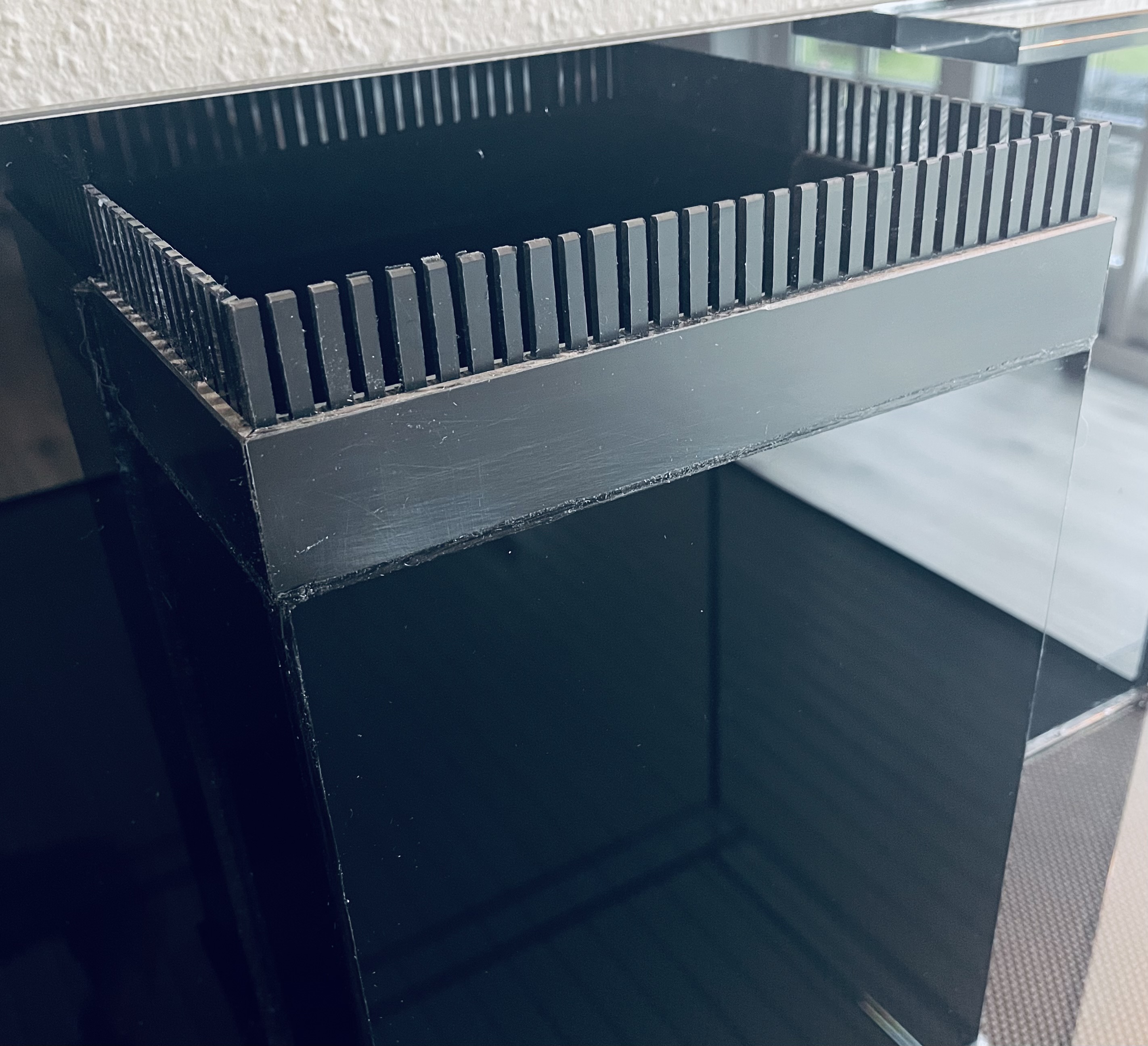 Optiwhite hele vejen rundt. 80x70x40cm sort overløbskasse og folieret baggrund. Overløbskammen er limet oven på glasset i stedet for på siden af overløbet, det giver et meget pænere finish.