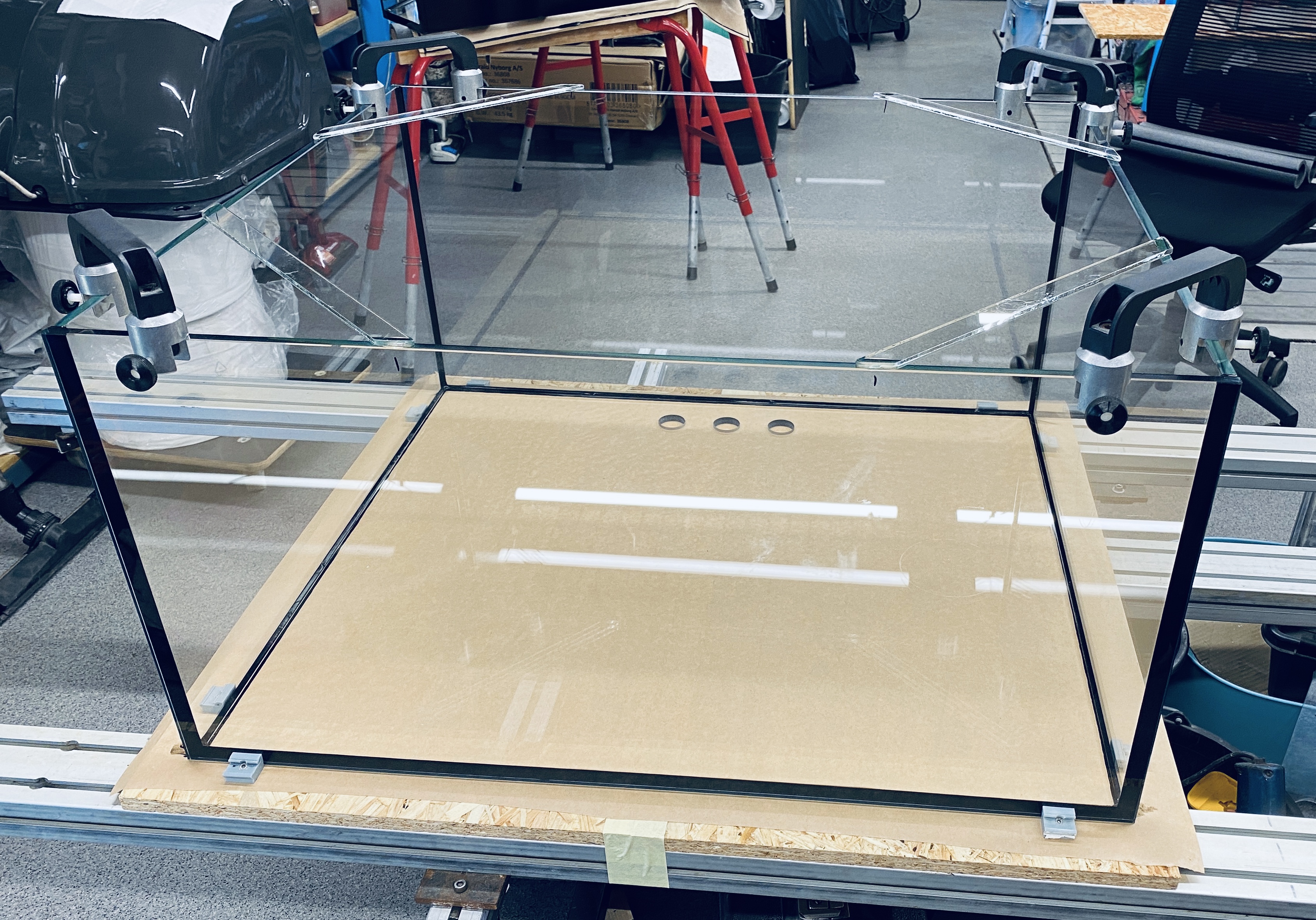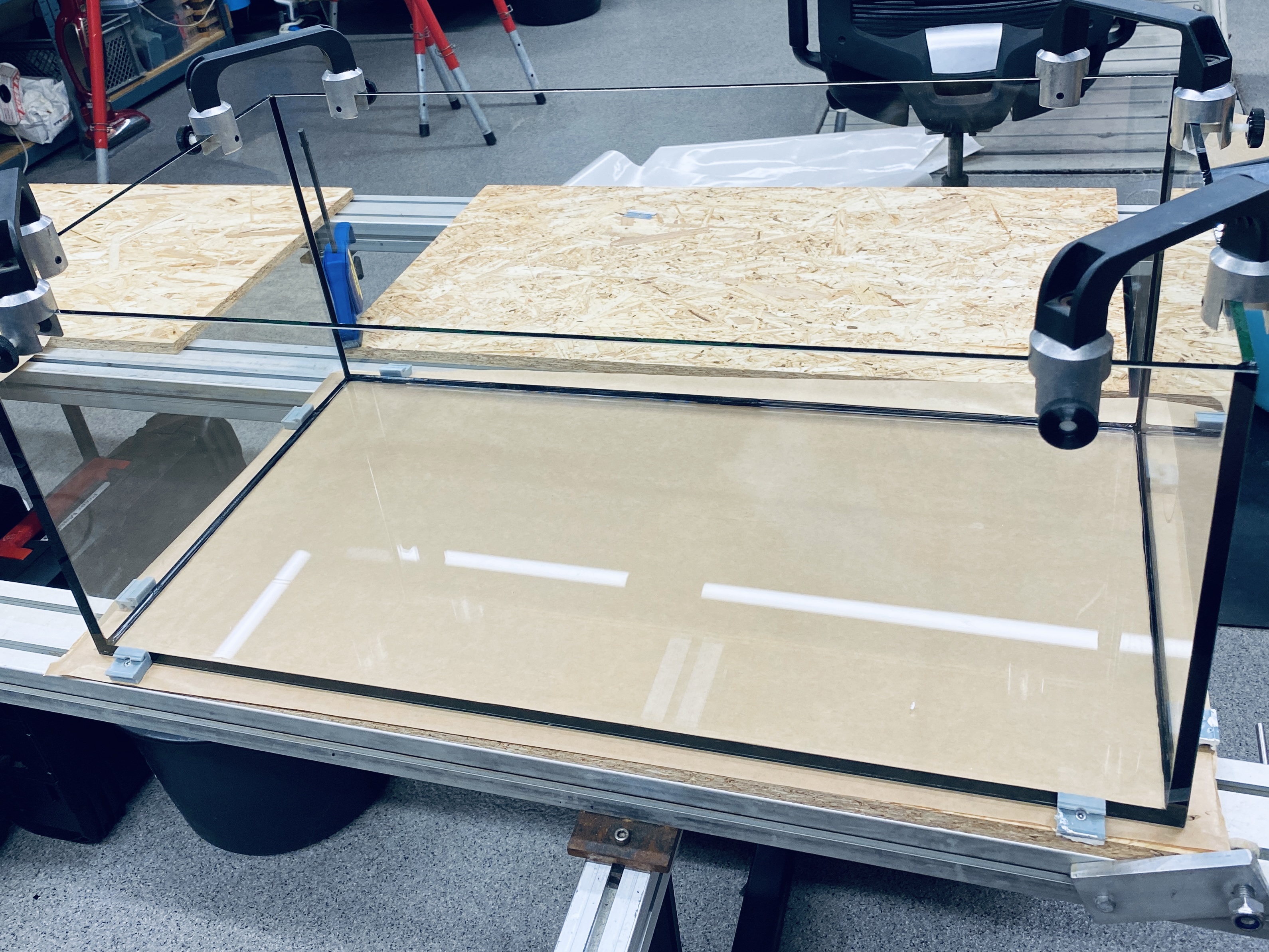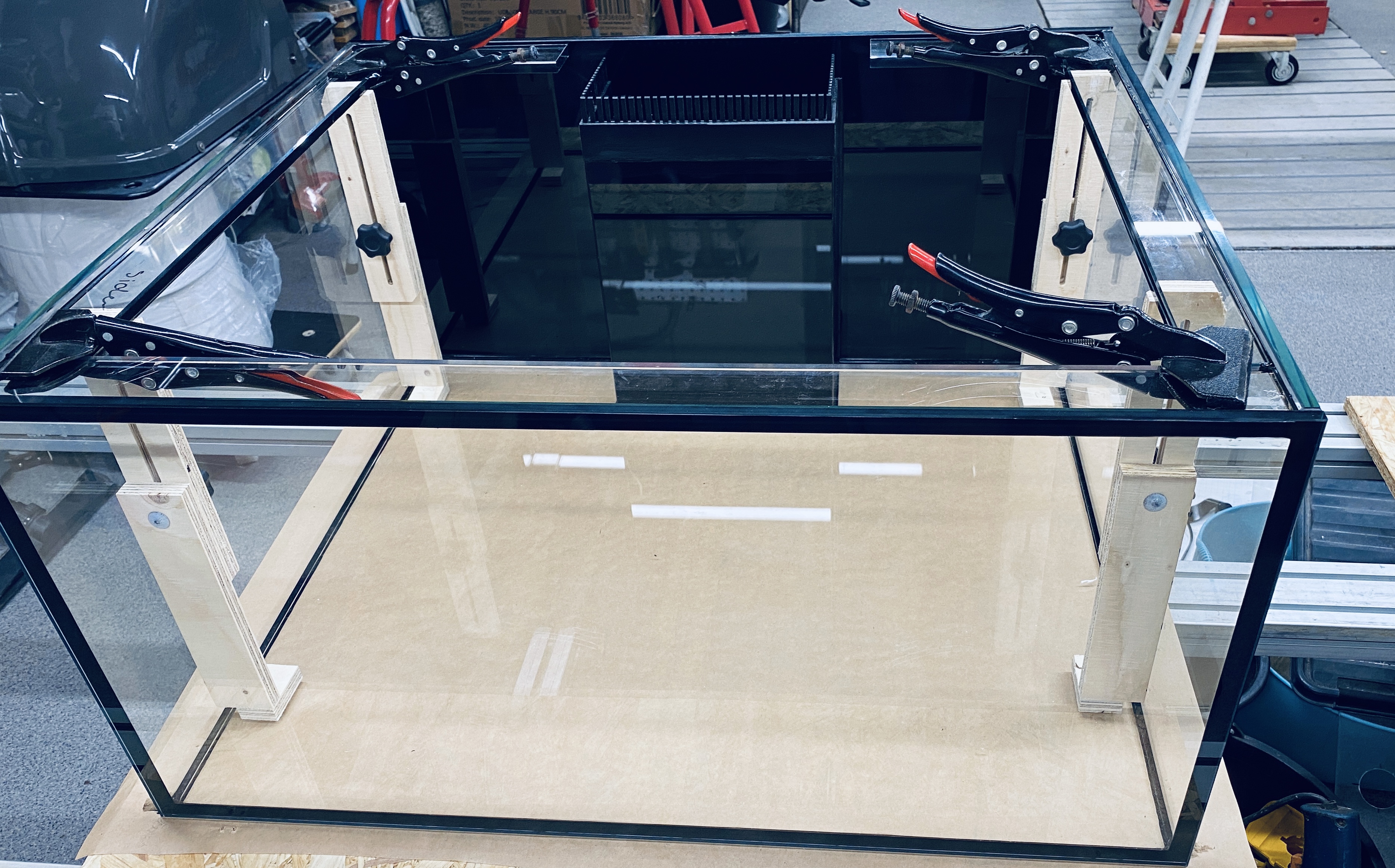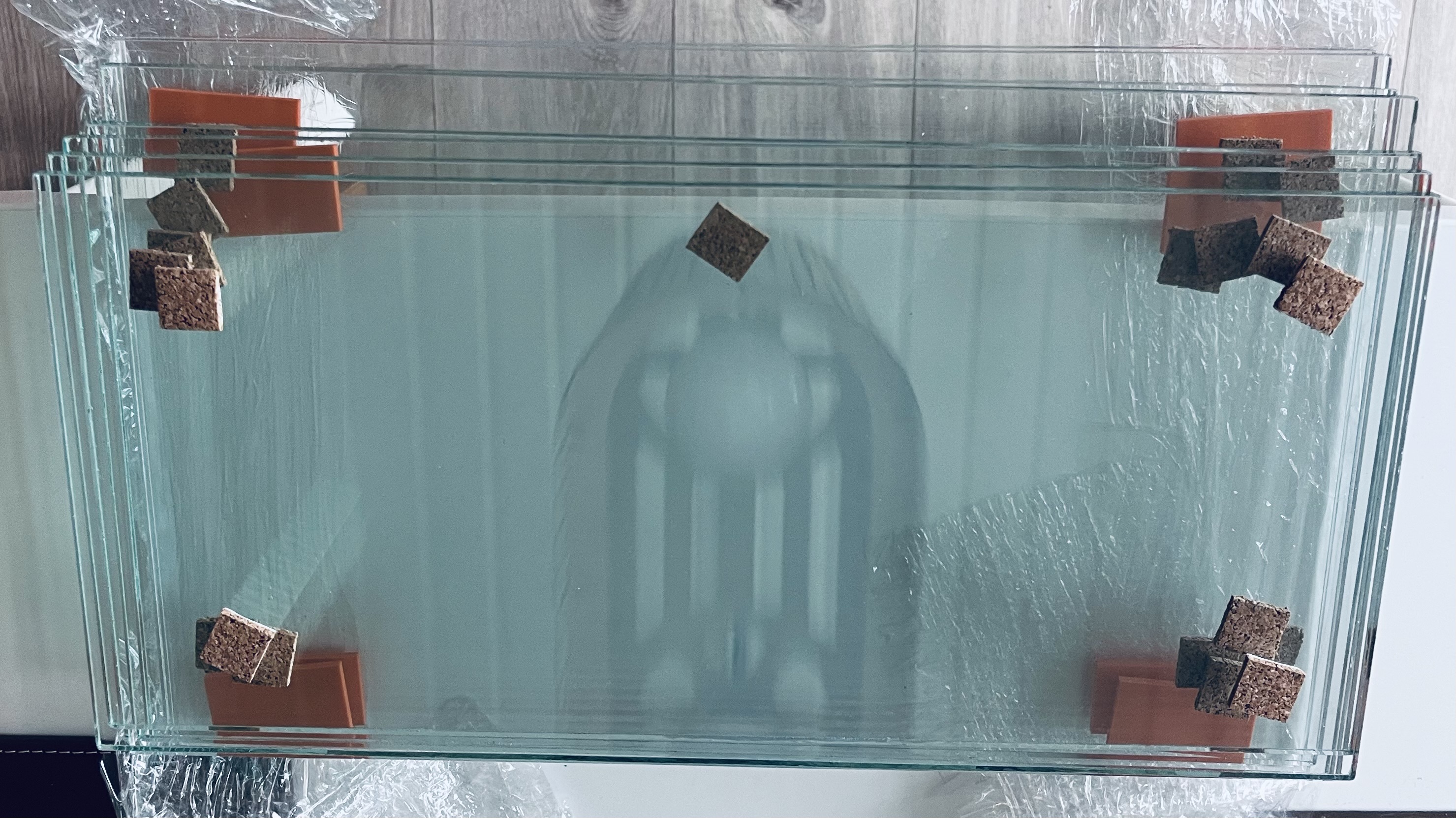 Optiwhite hele vejen rundt. 80x70x40cm sort overløbskasse og folieret baggrund. Overløbskammen er limet oven på glasset i stedet for på siden af overløbet, det giver et meget pænere finish.