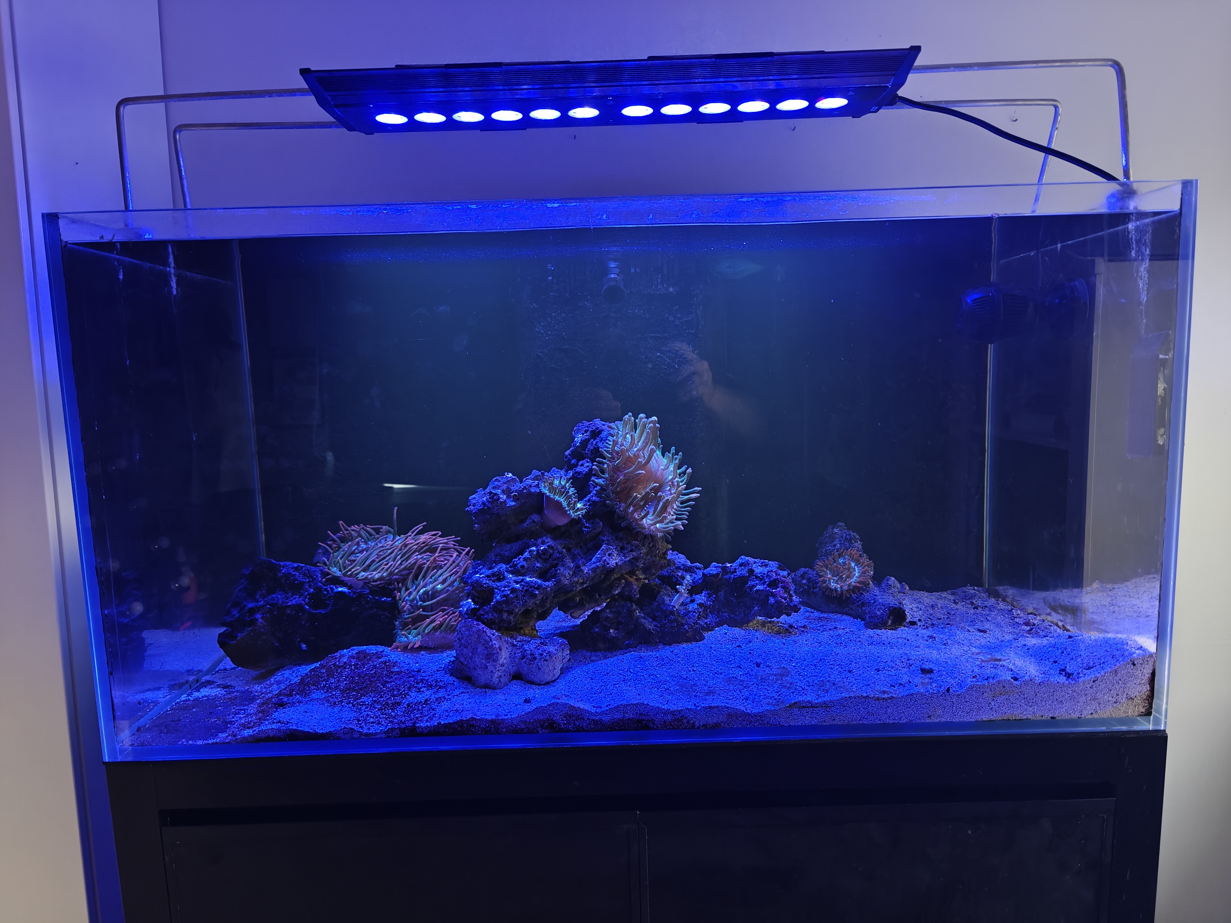 Blue Marine Reef 350 110x60x55 (lxbxh), Blue Marine sump skimmer 2000, Aqua Medic DC Runner 3.3, Maxspect Gyre XF330 Dual, Reef Factory Dosing Pump ATO, 3x AiPai A8 Max.