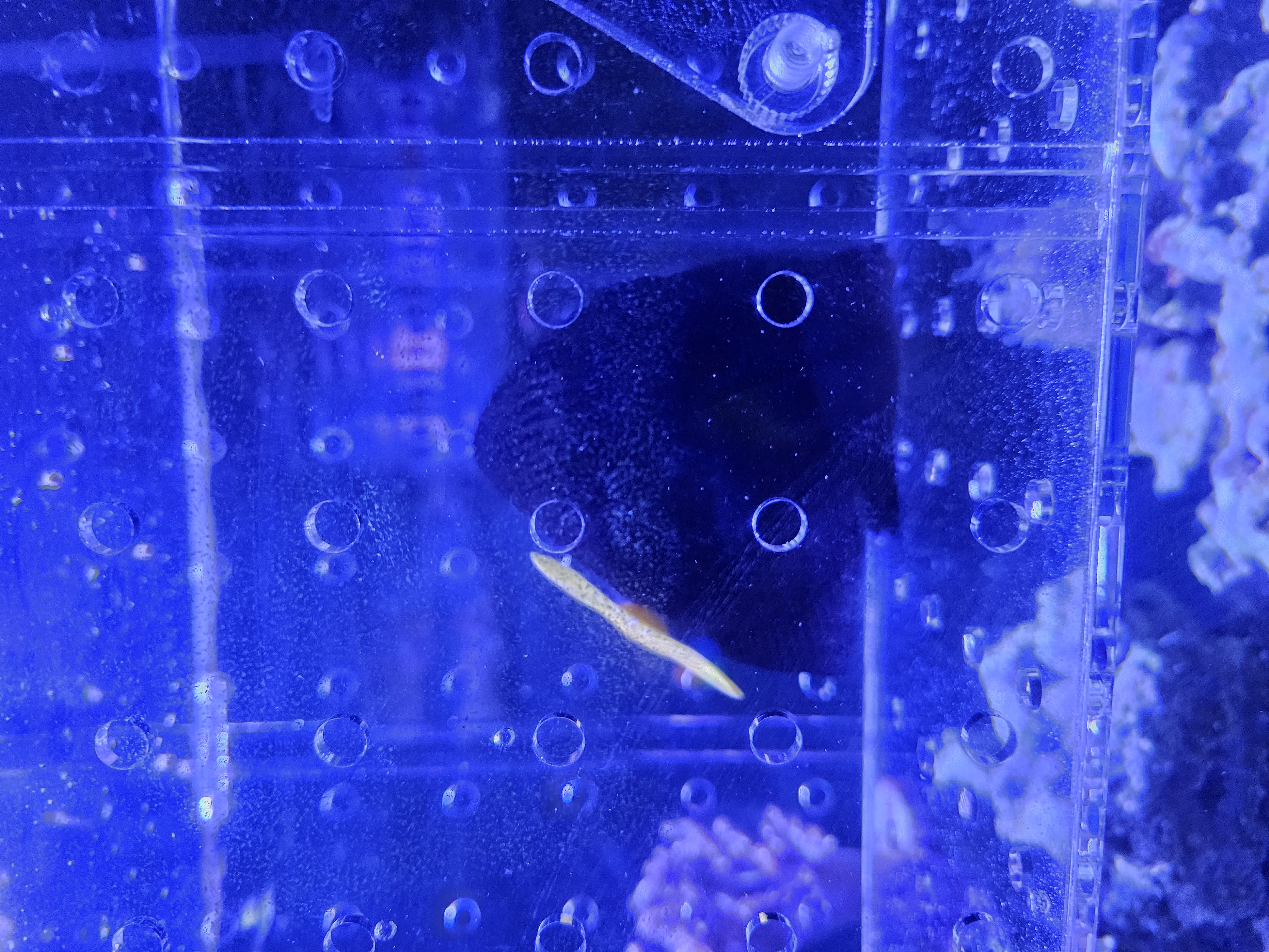 Har en purple tang som trænger til nyt vand, den er størrelse mellem / stor og spiser alt hvad der kommer ned til den.